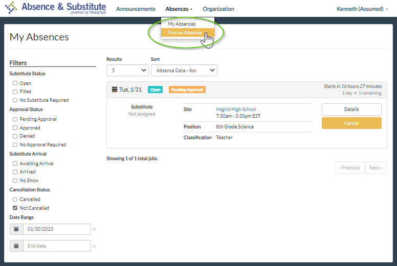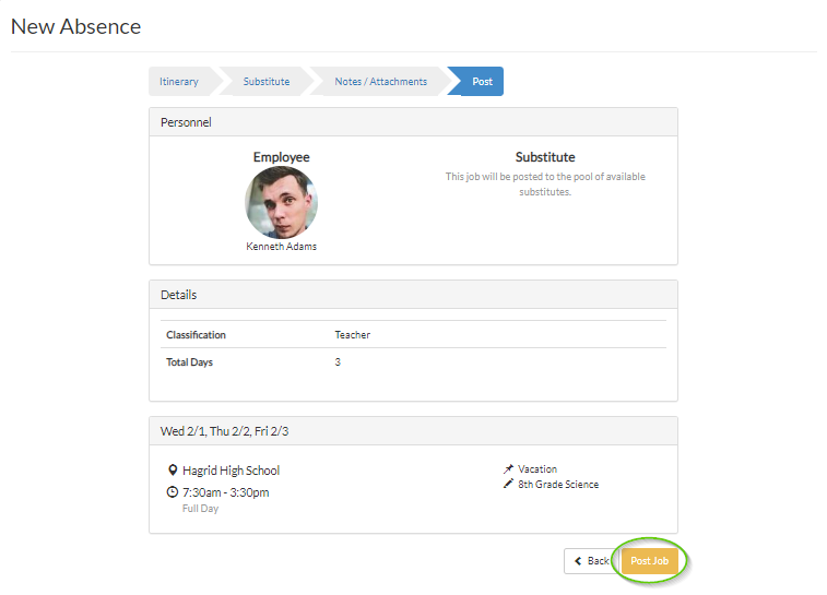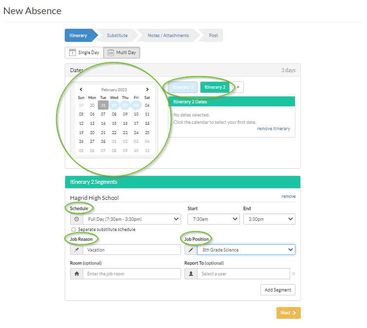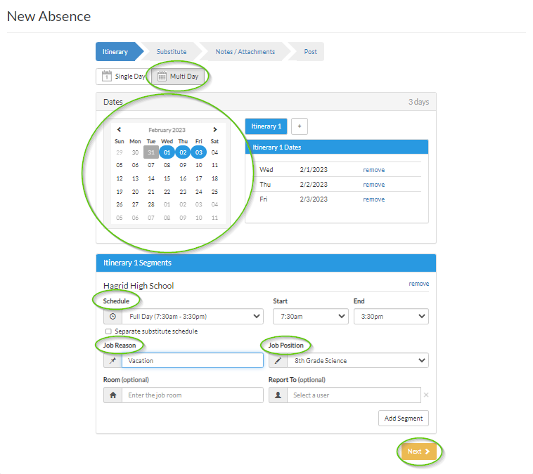 Note: To add dates with a different schedule, job reason, or position to the same absence you can add an Itinerary. See the section on multi-day absences with different schedules at the end of this article for more information.