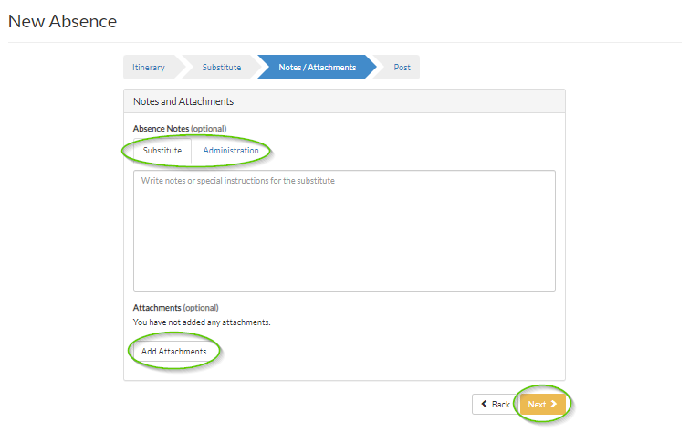 4. Add any notes/attachments for substitutes or administration then click Next.