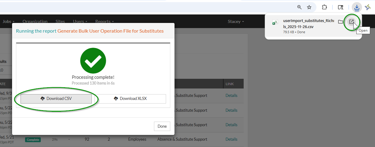 3. Once the file has finished generating, click Download CSV. followed by the Open icon within your browser.