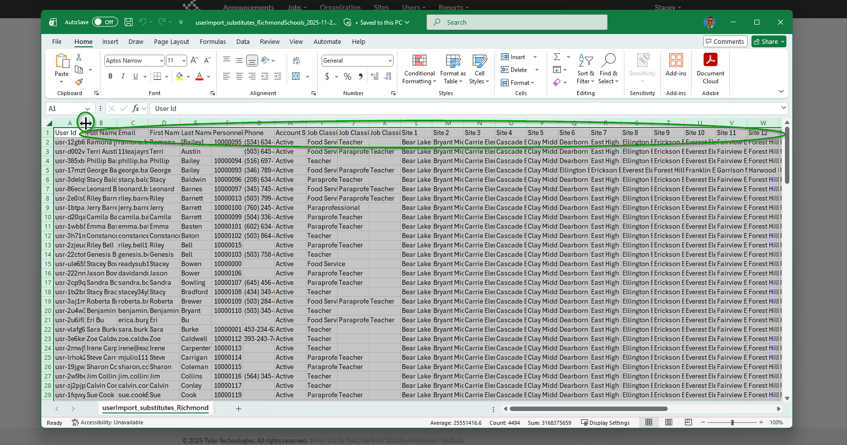 - For Absence & Substitute generated files, we recommend using the User Id field when bulk updating files that were generated from Absence & Substitute because this Id is native to Absence & Substitute and cannot be change. It also allows Personnel Ids and email addresses to be updated if needed vs. the Personnel Id or Email address which can change a given user. When changed, Absence & Substitute will create a new user instead of updating the existing user because it doesn't recognize the value (email or Personnel Id it is keying off of. This scenario is avoided with the User Id field.