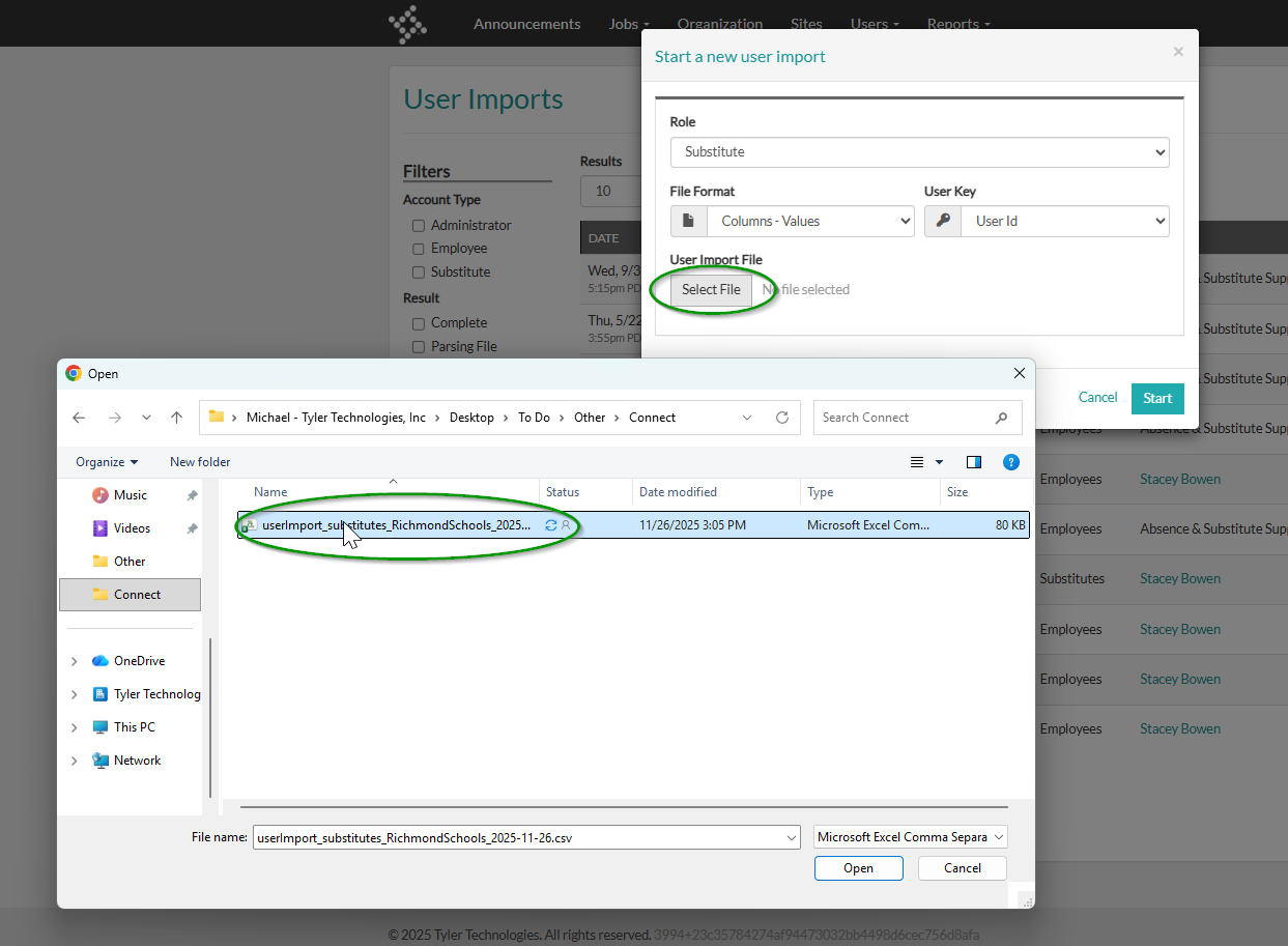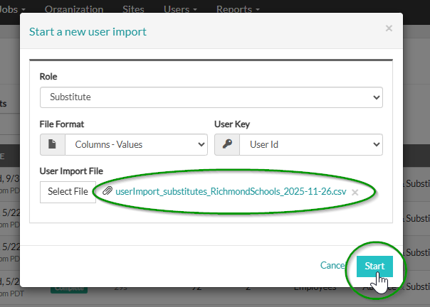 9. Verify the .CSV file is present within the new user import modal, then click Start to start the import.