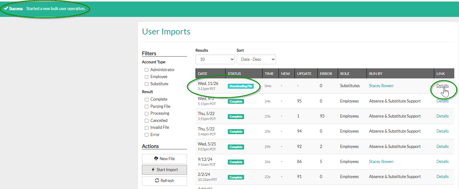 10. Notice the green banner towards the top of the screen indicating a new bulk user operation has started. Click the Details link to view the results of the import. See the How to view user import results solution record.