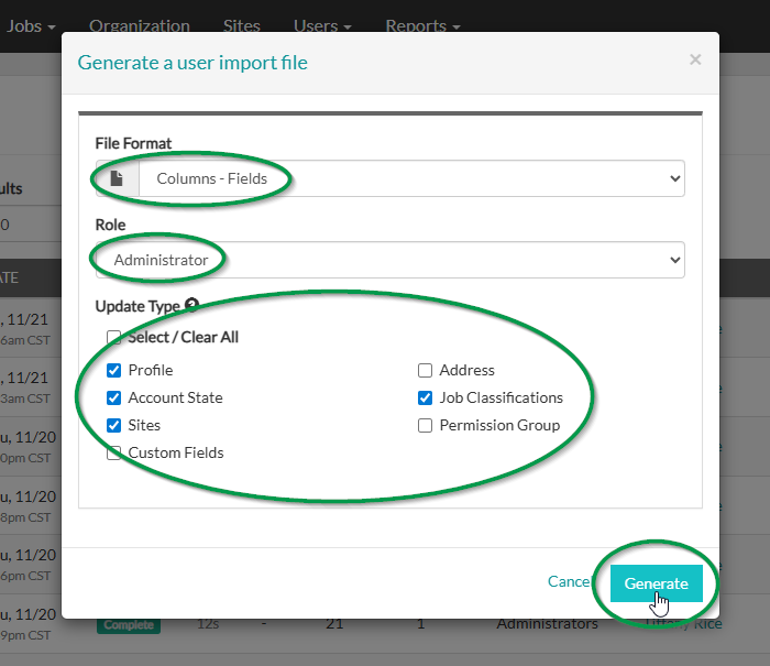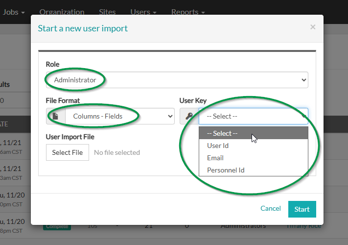 7. Select the Administrator Role and the same File Format you chose when generating the file (in this case the Columns - Fields format) followed by the User Key which is the value the import will key off of for each user, and has three options:
