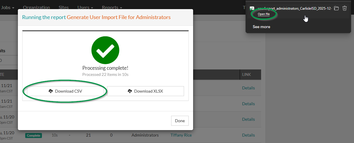 3. Once the file has finished generating, click Download CSV. followed by the Open icon within your browser.