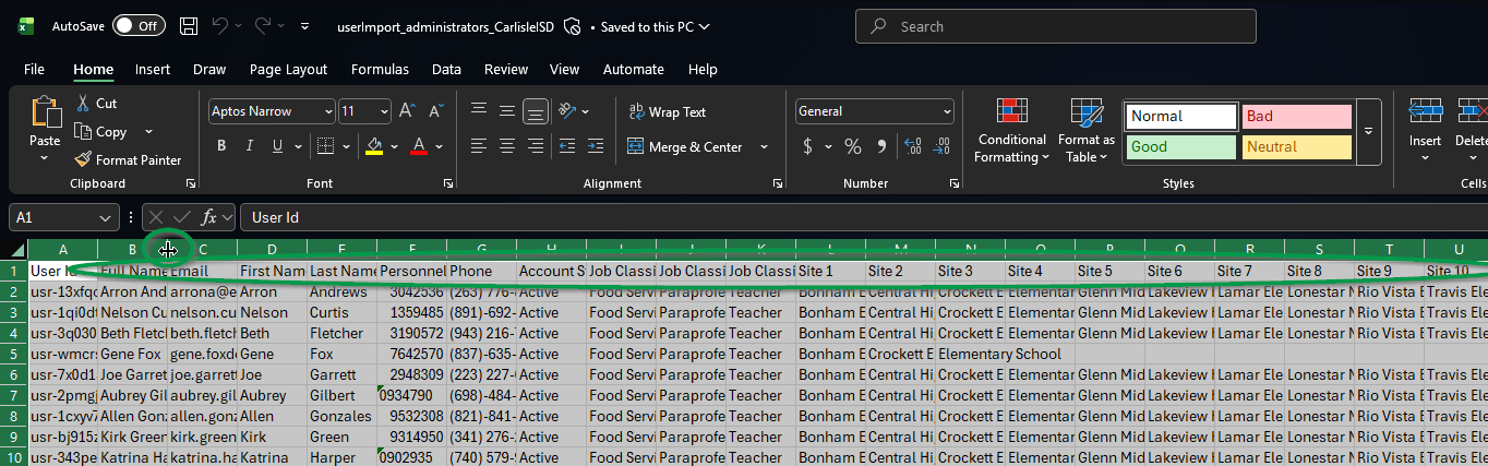 Note: Within the .CSV file you can highlight all cells and double click between two of the columns to automatically adjust each column width to match the corresponding text for better visibility.