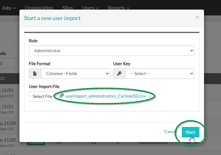 9. Verify the .CSV file is present within the new user import modal, then click Start to start the import.