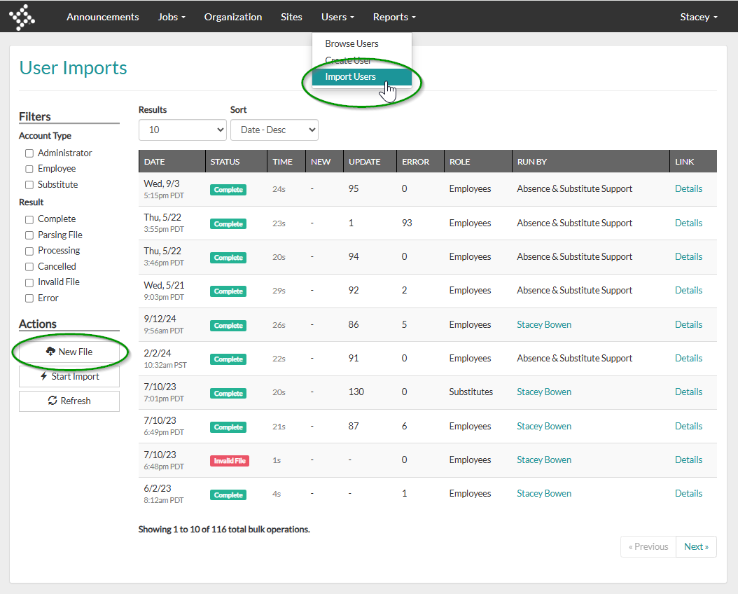 - For Absence & Substitute generated files, we recommend using the User Id field when bulk updating files that were generated from Absence & Substitute because this Id is native to Absence & Substitute and cannot be change. It also allows Personnel Ids and email addresses to be updated if needed vs. the Personnel Id or Email address which can change a given user. When changed, Absence & Substitute will create a new user instead of updating the existing user because it doesn't recognize the value (email or Personnel Id it is keying off of. This scenario is avoided with the User Id field.